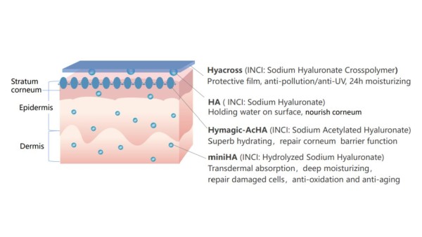 Under Hyacross™, there are two medium molecules, Hybloom™ and Hymagic™-AcHA. Hybloom™ has a molecular weight ranging from 200,000-1,800,000 Da, which can lock moisture on the skin surface and soften cuticular layer. The introduction of acetyl group in Hymagic™-AcHA Sodium Acetylated Hyaluronic brings lipophilicity to HA, which improves its moisture retention and repair.